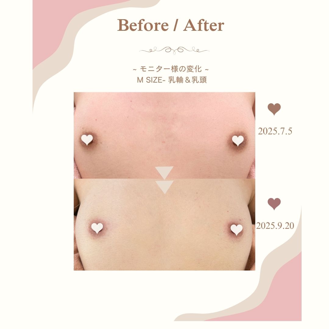 温泉に行くのが好きだけどコンプレックスに思っていた、とのことでご来店いただきました。施術中のお痛みやひりひり等なくお受けいただけました。一ヶ月経過時点で受ける前は暗めだった色味が明るいピンクに近づき一目でわかるほどの変化に♪ご自宅ではアフタークリームをご使用いただいております。*ローマピンクMパーツ*施術後2ケ月での比較